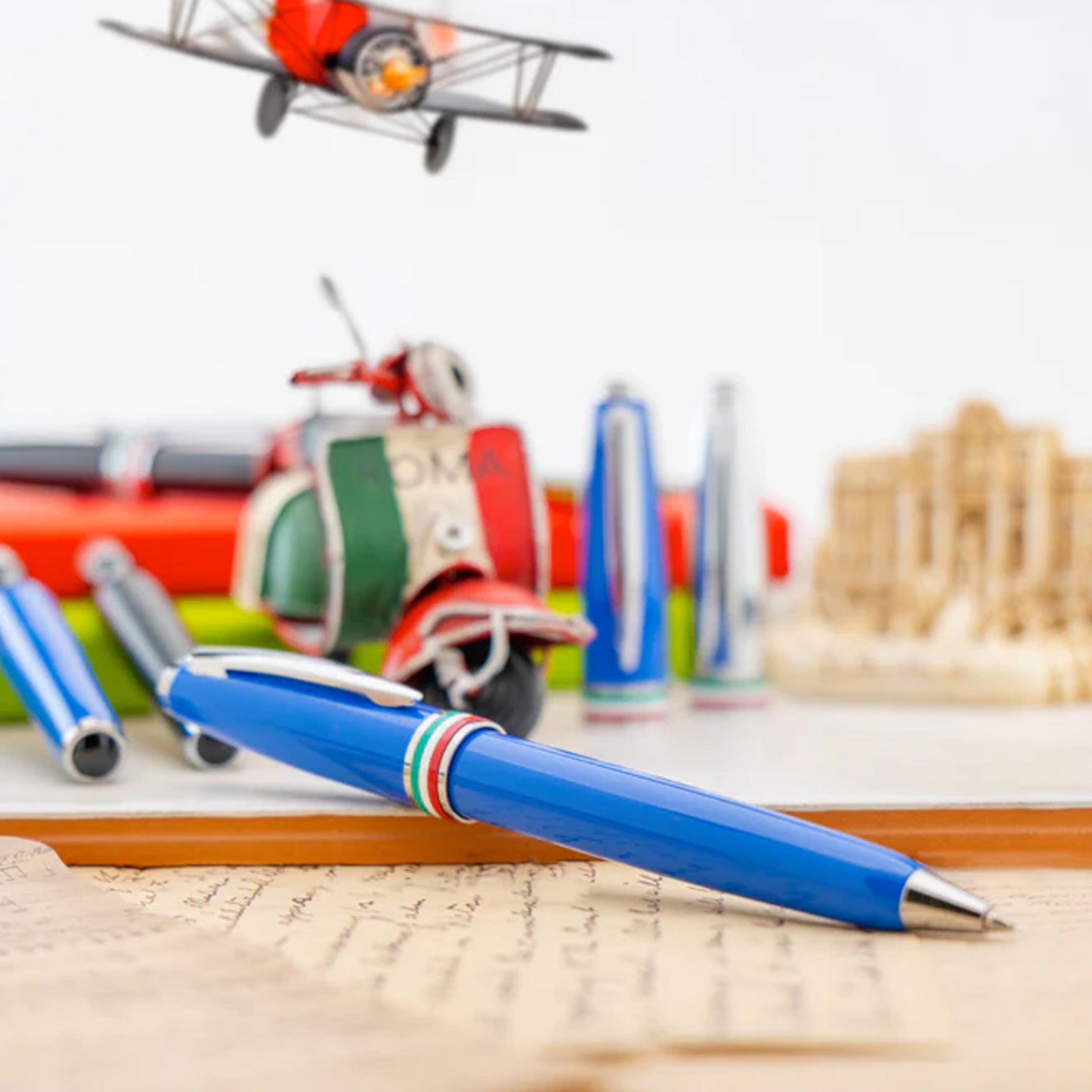 We are honoring the country that gave us the Espresso, Pasta, Gelato, Pizza, Sophia Loren, Dolce Vita, Gondolas and a lot more. The Aldo Domani – Italia pens are made of solid brass and lacquered to perfection. Available in: black matte, mirror chrome and exotic blue. The middle ring adorns the famous three colors, also known as tri-color (tricolore’) of the Italian flag. Some say that the green represents freedom, white for faith & purity and red for love. The fountain pen is equipped with a stainless steel JoWo nib engraved with the Monteverde USA® logo and fills via standard cartridge or converter (both included). The nib is available in Extra Fine, Fine, Medium, Broad, 1.1mm Stub and Omniflex point sizes. The twist action ballpoint fills with standard Parker® style refills. Each pen comes in a luxury gift box with a custom designed sleeve.