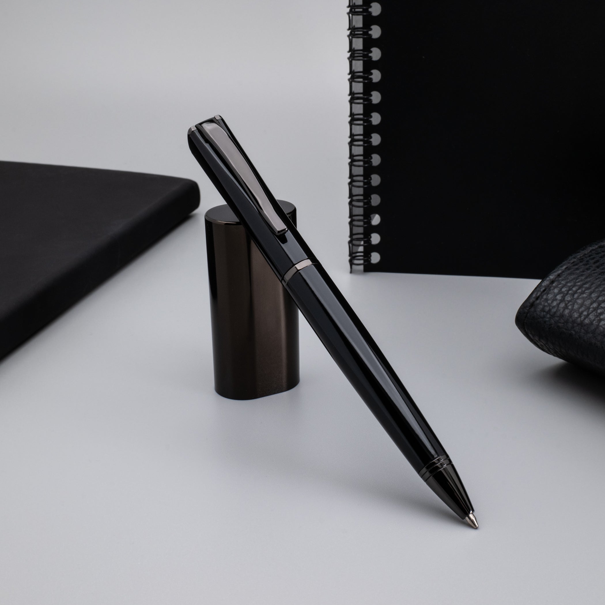 The sleek clip has a spring action that makes for smooth placement and removal from the pocket. The classic Black option is available with either gun metal or rose gold trim, while the Gun Metal has striking metallic red trim, and the blue is paired with metallic blue trim. Mode choices include Ballpoint, Rollerball, or Fountain Pen with a large flexible nib either in Fine, Medium, Broad, or Stub.