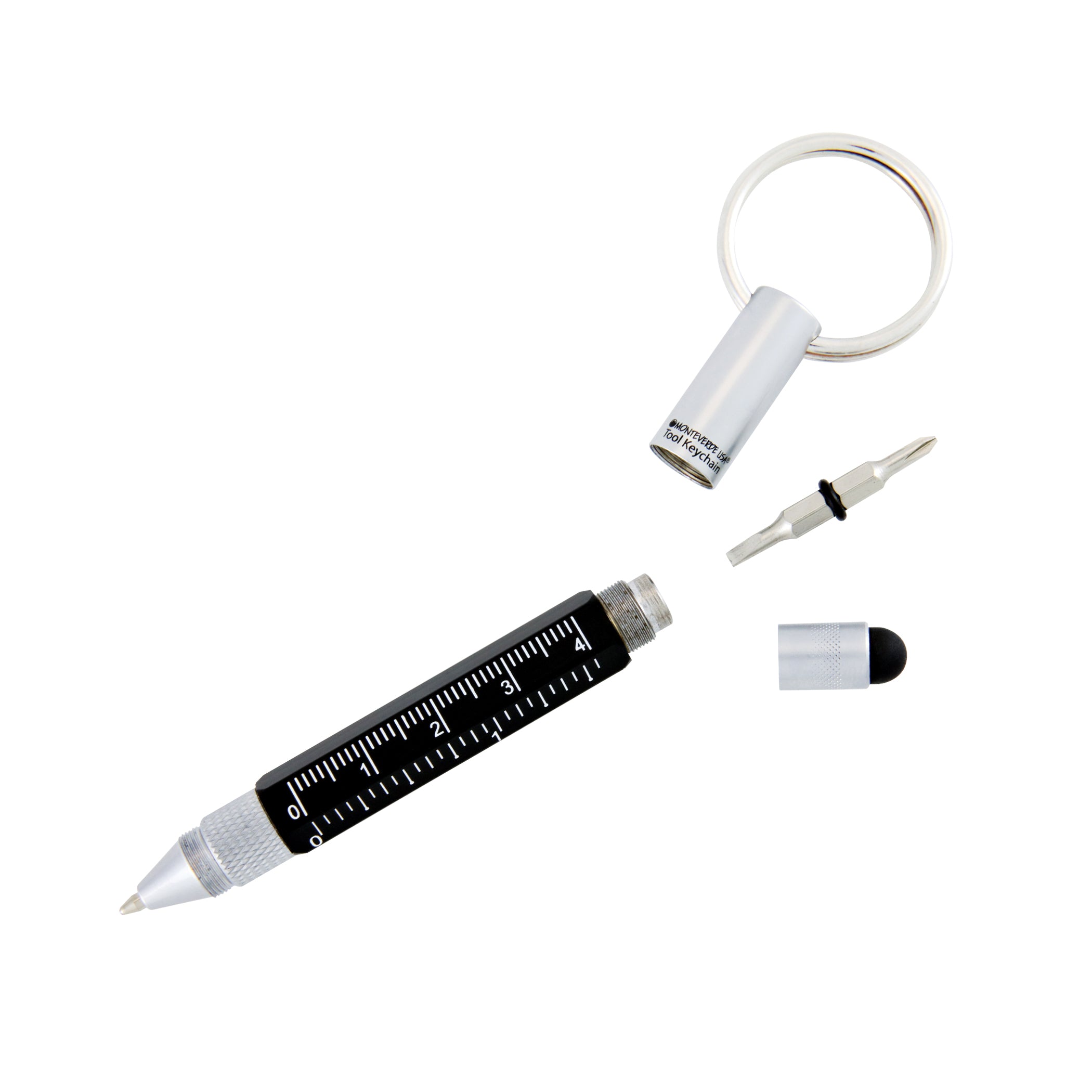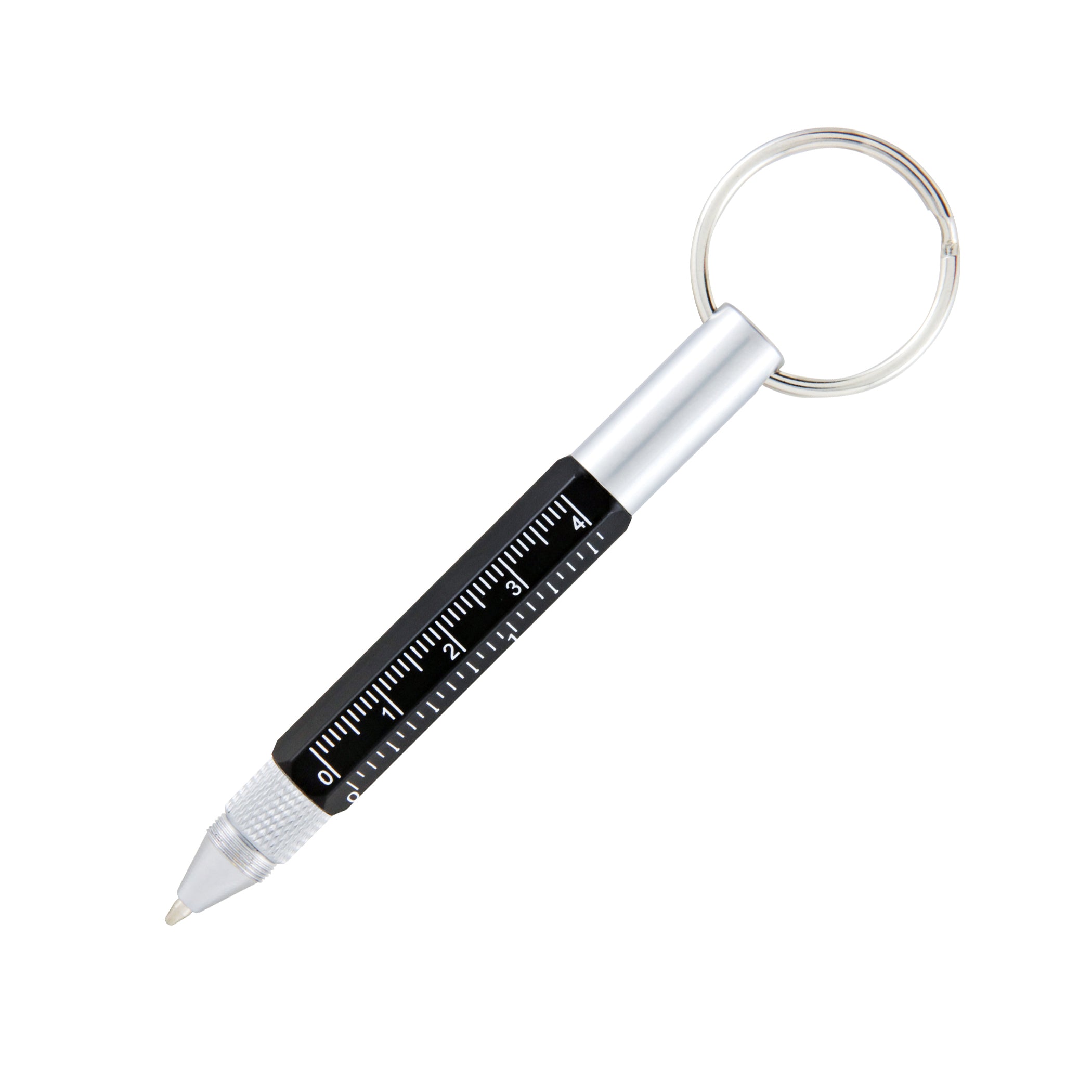Similar to its large predecessor, the Tool Pen Keychain utilizes a similar design, a heavy duty six sided barrel that houses a smooth writing ballpoint refill, hidden touch screen stylus, as well as a mini Philips and flathead screwdriver. Along the barrel you can find two mini scale functions, measuring just over 1.5 inches (or 4 cm) maximum. Perfect for on the go and ready for any job, attach to your key ring, work bag, or clipboard.